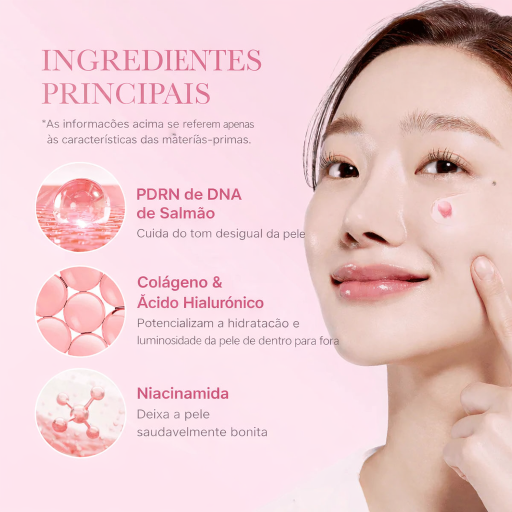 O PDRN (Polidesoxirribonucleotídeo) é um ativo de última geração, derivado do DNA do salmão e altamente compatível com as células da pele humana devido à sua semelhança estrutural com o nosso próprio DNA.